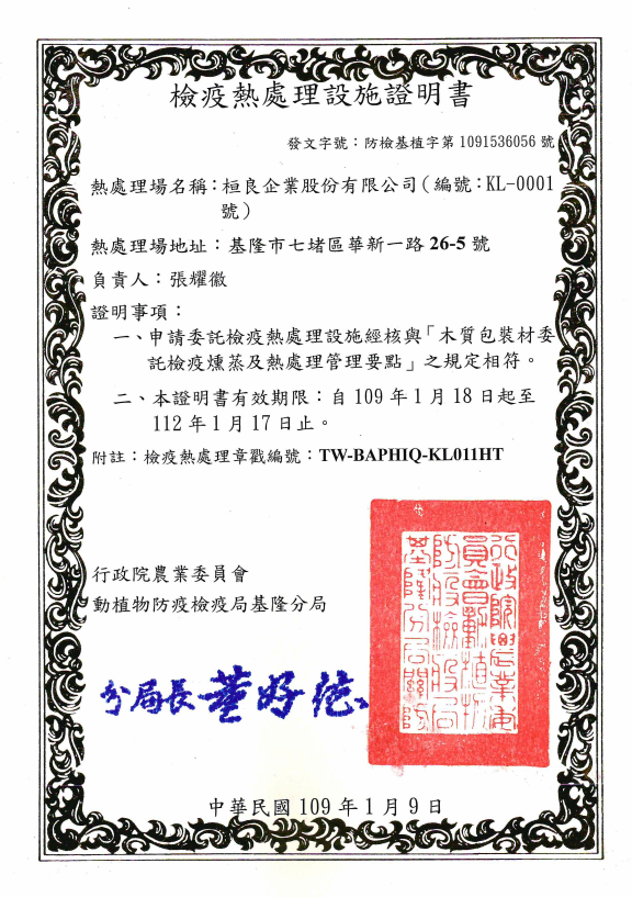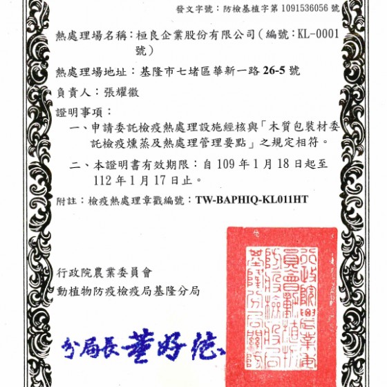 檢疫熱處理,說明:符合ISPM15IPPC規章,並加施專用章戳及開立熱處理證明